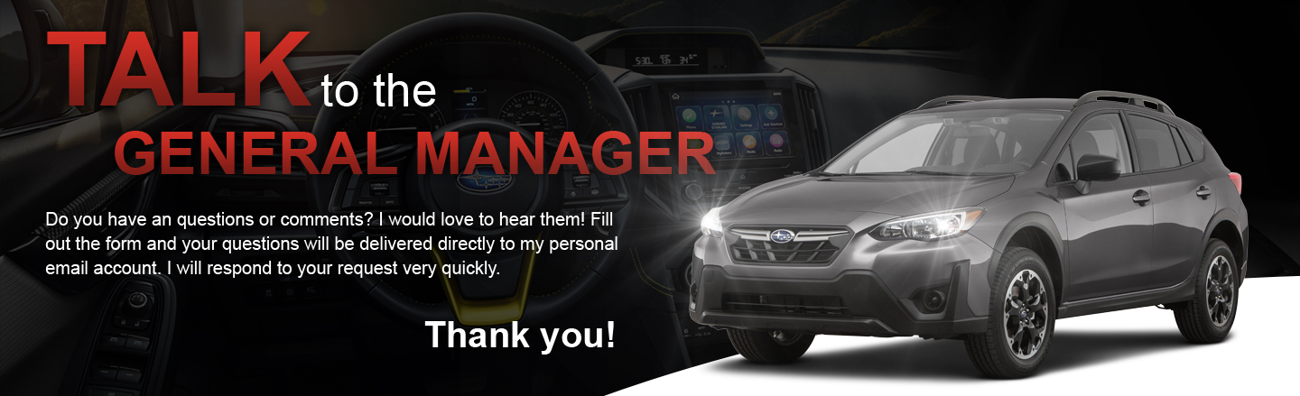 Subaru of Fort Myers Fort Myers FL As the General Manager, I would like to welcome you to our website. I am honored that you would consider us for your Sales and Service needs. Thank you for reaching out to me. I encourage you to share anything that is on your mind. Whether it’s a question, complaint, issue, suggestion, purchase inquiry, or comment, I welcome the chance to get involved and help. I also enjoy hearing good news. Please fill out the form and your message will be delivered to my personal email. I will respond to your message as soon as possible. Thank you!
